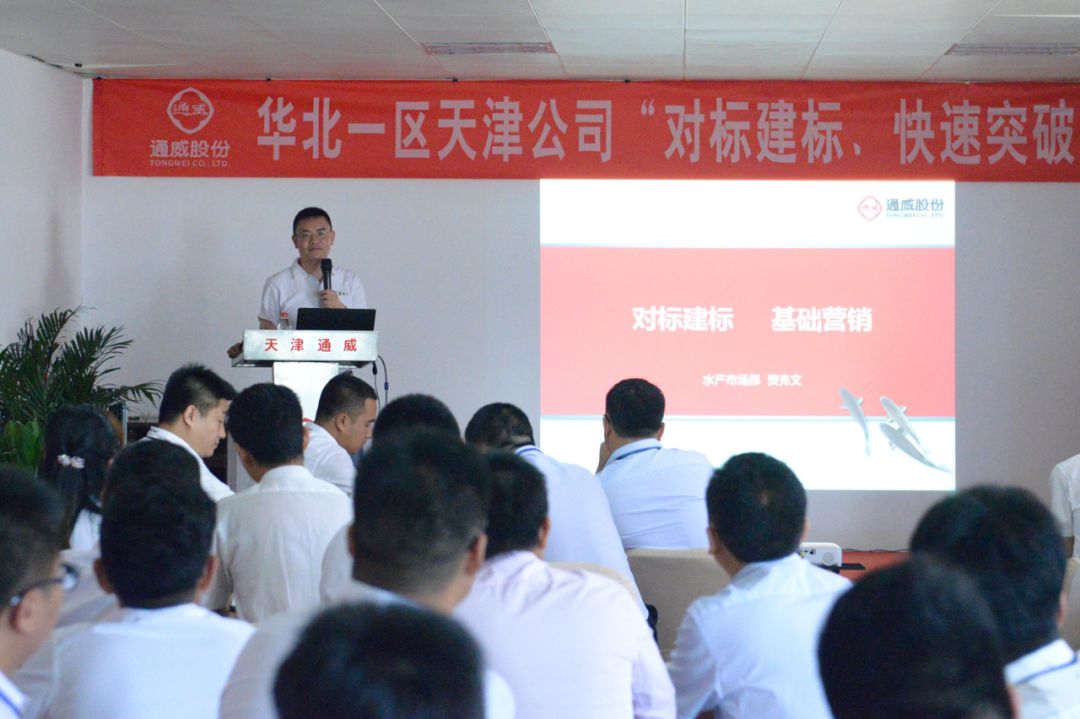 会上, 通威大学执行副校长张红缨对天津通威全体水产人员介绍了”营销3问+1”现象,引发全体人员的积极思考,并分享了海南通威逆势而上、量利双增的优秀成功案例,引导天津通威全体水产营销人员针对自己目前市场所存在的问题进行研讨,与海南通威对标建标,找到解决办法,寻找突破点。张校长强调,大家要“沉下心、扎实做、出效果,看得见、摸得着、所向披靡”。通威股份华北一区技术总监潘化祥对天津通威2018年的产品目标进行定位分析讨论,提出要强化产品目标,加强对竞争对手的跟踪。